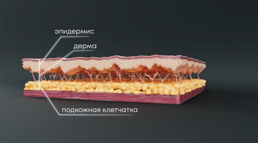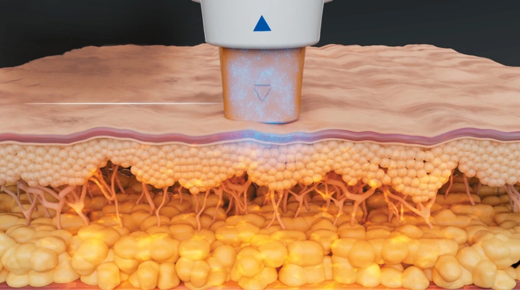Радиочастотная энергия проходит через кожу, воздействуя на дерму, фиброзные септы и глубокие связочные структуры.